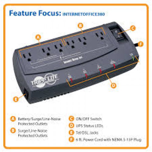 INTERNETOFFICE300 Internet Office 120V 50/60Hz 300VA 150W Standby UPS, Ultra-Compact Desktop 6 Outlets, Tel/DSL/Ethernet Protection, TAA