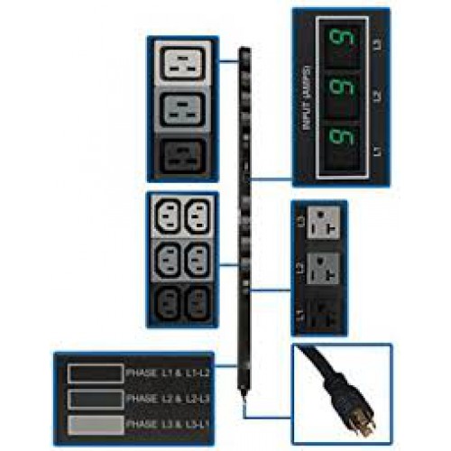 PDU3MV6L2120 5.7kW 3-Phase Metered PDU, 208/120V Outlets (36 C13, 6 C19, 6 5-15/20R), L21-20P, 6ft Cord, 0U Vertical, TAA