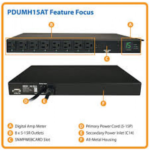 PDUMH15AT 1.4kW Single-Phase ATS / Metered PDU, 120V (8 5-15R), 2 5-15P, 100-127V Input, 2 12ft Cords, 1U Rack-Mount, TAA