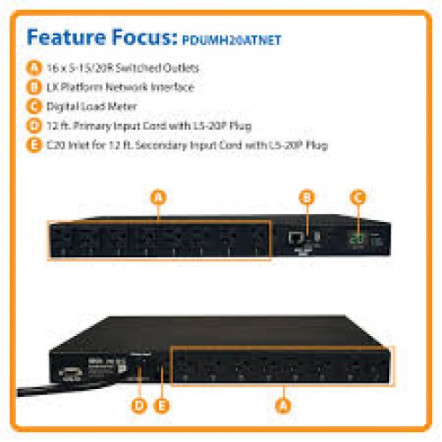 PDUMH20ATNET 1.9kW Single-Phase ATS / Switched PDU with LX Platform Interface, 120V Outlets (16 5-15/20R), 2 L5-20P / 5-20P 12ft 120V Inputs, 1U Rack-Mount, TAA