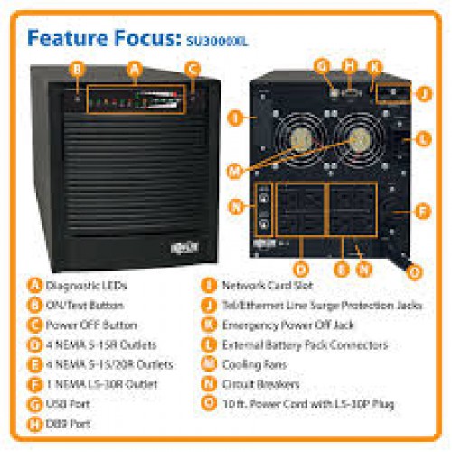 SU3000XL SmartOnline 120V 3kVA 2.4kW Double-Conversion UPS, Tower, Extended Run, Network Card Options, USB, DB9 Serial