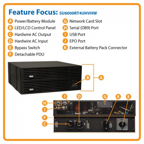 SU6000RT4UHVHW SmartOnline 208/240, 230V 6kVA 5.4kW Double-Conversion UPS, 4U Rack/Tower, Extended Run, Network Card Options, USB, DB9 Serial, Bypass Switch, Hardwire
