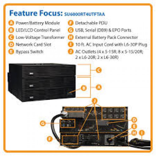 SU6000RT4UTFTAA SmartOnline 120/208/240V 6kVA On-Line UPS – Double Conversion, 5.4kW, 6U, Network Card Option, TAA Compliant