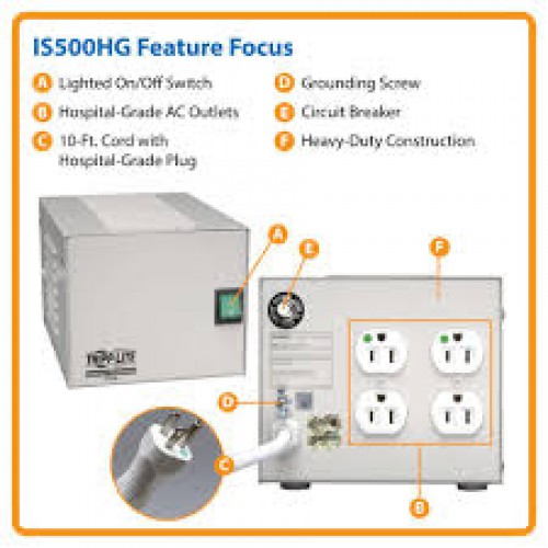 IS500HG Isolator Series 120V 500W UL 60601-1 Medical-Grade Isolation Transformer with 4 Hospital-Grade Outlets